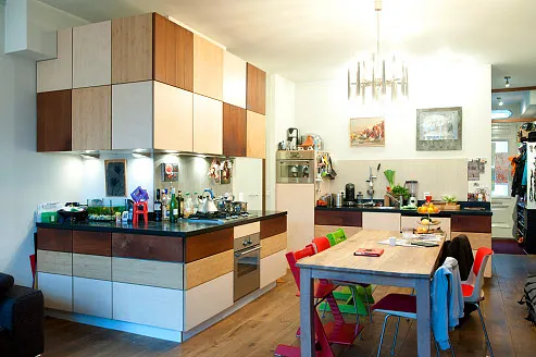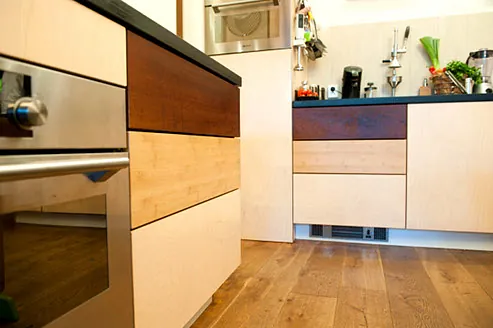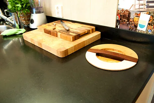 For a family of five, this kitchen is the central spot in the house. It was designed to fit their taste and lifestyle like a glove. The dark Bluestone top, together with the solid Greenheart, Bamboo and White-washed plywood creates a characteristic homey feeling. Pictures recent, kitchen in use since 2006.