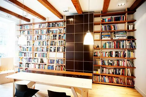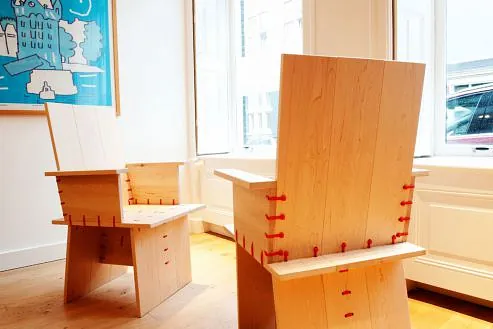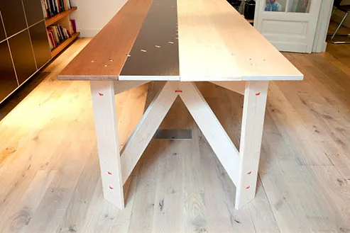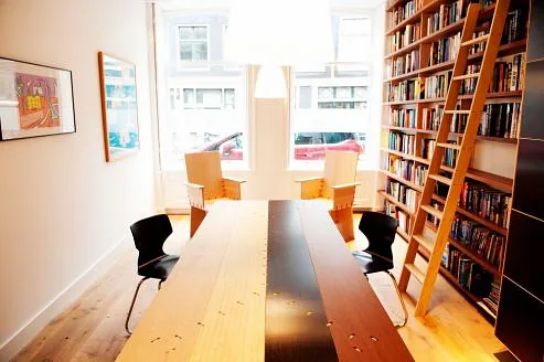 Four different materials are used in this interior: dark brown Concrete plywood, solid Meranti, Bamboo and solid Maple. They all come together in the central-object of the space, the Ty-Rap Conference table. Bookcase 'Stack' and storage closet 'Squary' make an impressive wall-filling combination. A simple bamboo ladder gives acces to the upper shelves and storage compartments. The design of Ty-Rap armchair 'Sewey' was especially developed to complete and give this space a fresh and modern look.