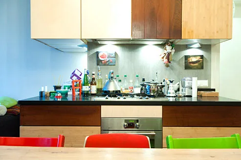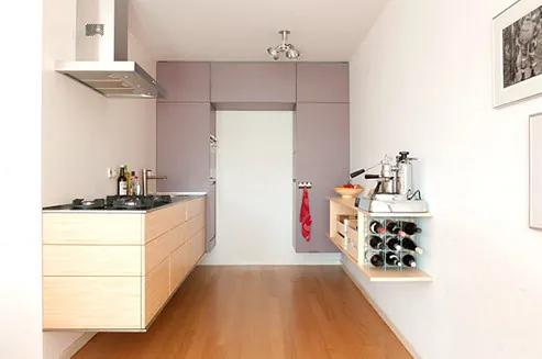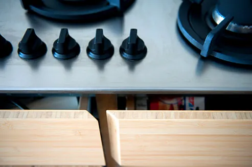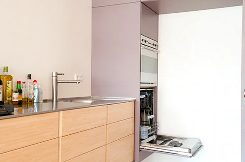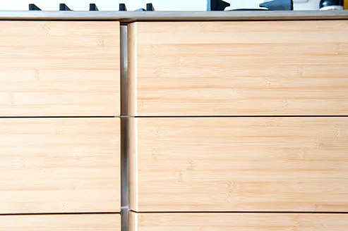 This spatial design, optimizes the use of the space. Dishwasher, fridge and oven are installed at the back, on a level where they are easy accessible. The combination of Bamboo, Grey Mdf and Stainless Steel, together with the simplicity in details, creates a contemporary modern kitchen.