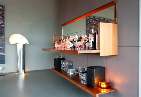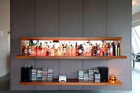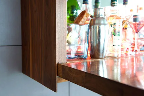 The requirement for this folding cocktail bar, was to create a piece that would stay in the family for several generations. In 2003 it was installed in the former house of this architect, in 2010 it moved to his new house in Amstelveen. When opened the lights switch on and you have your service-area ready. Made from American Nut.