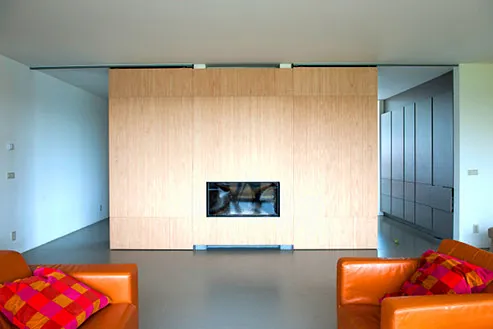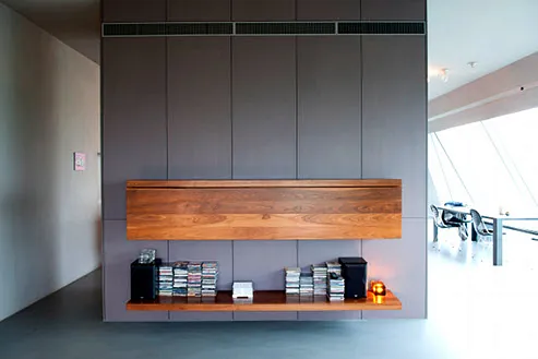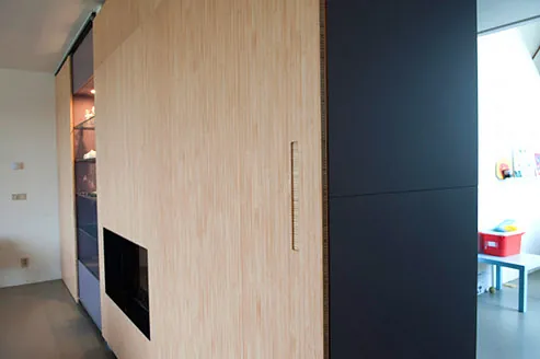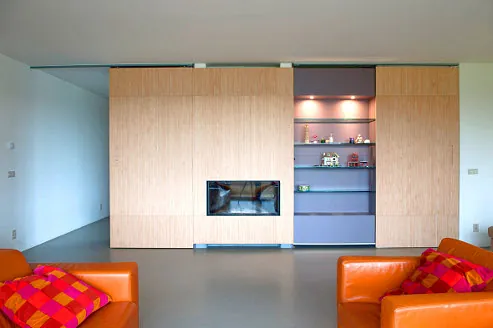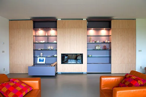 The Bamboo material around the fireplace gives an extra warm feeling to this living area. Hidden behind the sliding doors is a grey Mdf closet with enligthened glass-shelves, drawers and storage compartments.