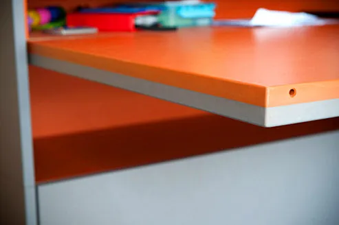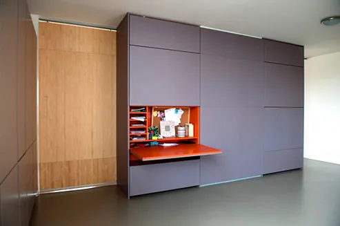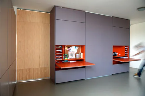 At the other side, two integrated folding desks, give a new function to the middle area of this groundfloor. The surprise effect of the orange Mdf interiors makes this an attractive spot for either home-office use or study.