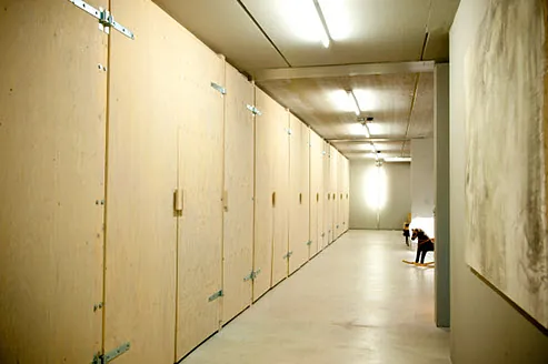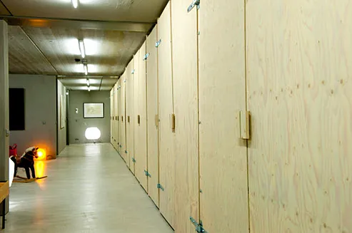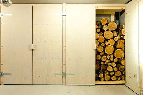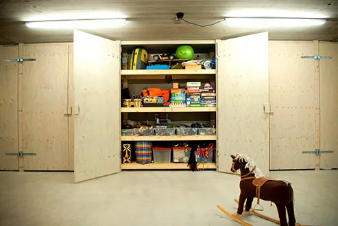 In the basement, the rough material of the 18.5 meter closet is quite an opposite, but perfectly balanced by it's detailed manufacturing. The compartments are customized for storage-purposes, tool-space, stocked wood, etcetera. The looks of the underlayment spreads a warm and pleasurable sphere in the basement.